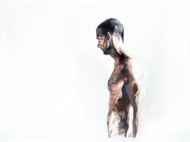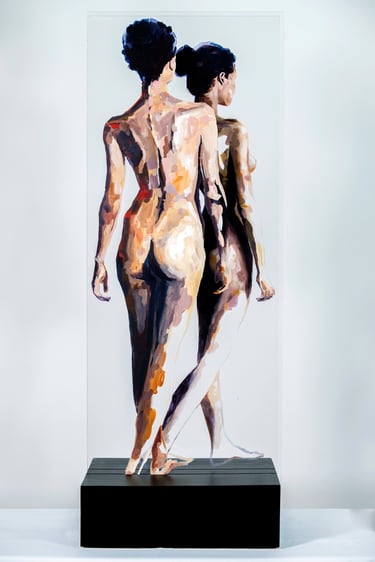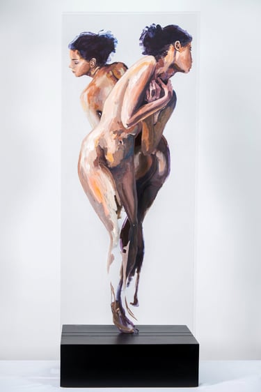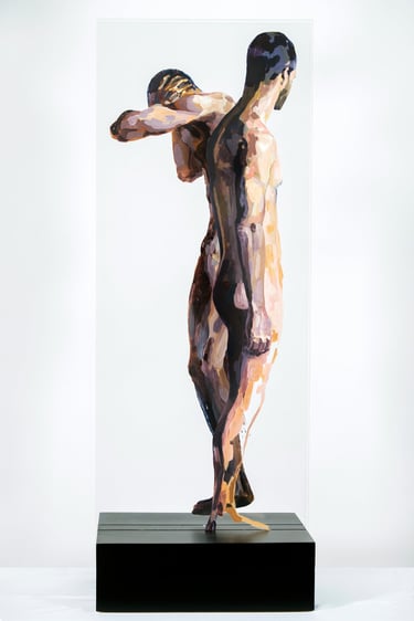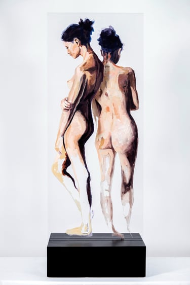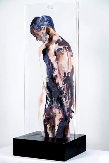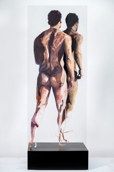 HUMAN/ Being is a series that explores the human condition through the body as a vehicle for emotional and social communication. Osvaldo Sequeira employs expanded painting on transparent methacrylate surfaces to depict figures that appear suspended, fragmented, or under tension—capturing nonverbal gestures that reveal deep aspects of our identity. The series invites reflection on how we inhabit space—both physical and symbolic—and how our emotions, intentions, and connections are expressed through the body.